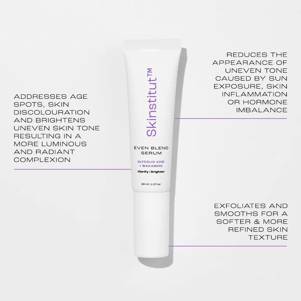Apply a pea-sized amount morning and evening (after cleansing and before moisturising) to areas of unwanted pigmentation, carefully avoiding the eye area. For best results, we like to use Even Blend Serum in conjunction with Skin Inject™ Derma Roller up to three times per week.