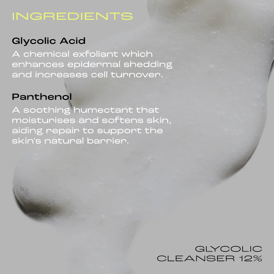 Use at night, no matter how tired you are. We recommend first removing your makeup and then using Glycolic Cleanser 12% as your second cleanse to remove daily grime, sunscreen, and makeup. Work a pea-sized amount between wet hands and lather over your face, avoiding the eye area, for no more than 30 seconds. Rinse thoroughly with warm water and gently pat dry. Follow with your serum and/or moisturiser.