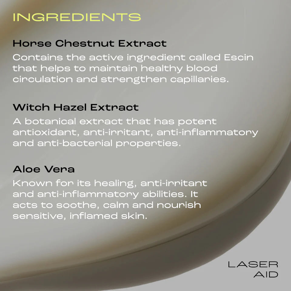 Apply liberally to skin inflammation or irritation up to four times per day until your redness subsides. Remove excess with tissue. As mentioned, you may feel a secondary warming sensation as Laser Aid is designed to draw heat out of the skin. Do not rub excessively. Do not apply over open skin. Do not use after treatment with Co2 lasers.